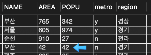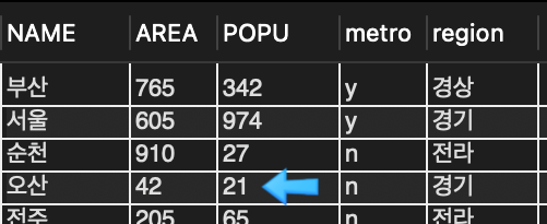 📌 popu의 원래 값을 읽어 그 두 배 값을 다시 popu에 대입하여 오산의 인구를 두 배로 늘림.
