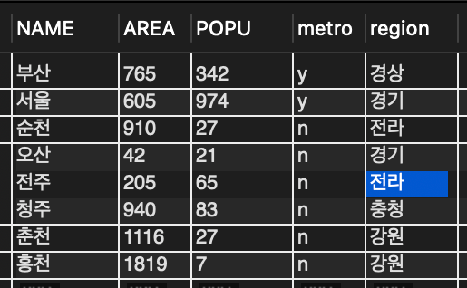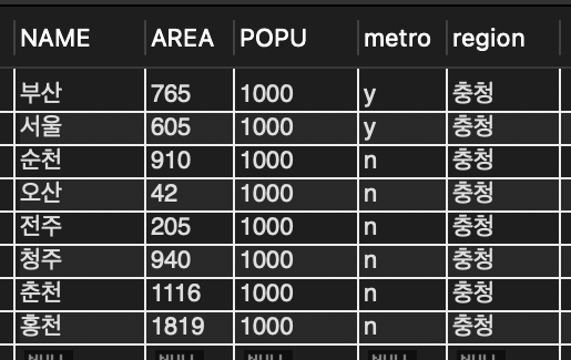 📌 서울의 인구를 1000만명으로, 지역을 충청도로 변경