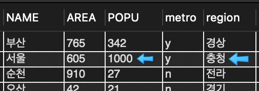 UPDATE tCity SET popu = 1000, region = '충청' WHERE name = '서울';