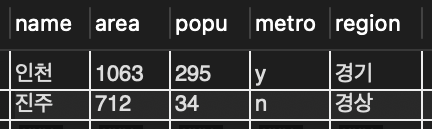 ➡️ 필드 목록에 metro가 아예 없는데 이 경우 디폴트가 적용되어 광역시가 아닌 것으로 삽입