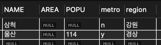 📌 울산은 면적을 모르는 상태여서 area 필드는 빼고 입력 ( 생략한 area는 NULL이 됨 )