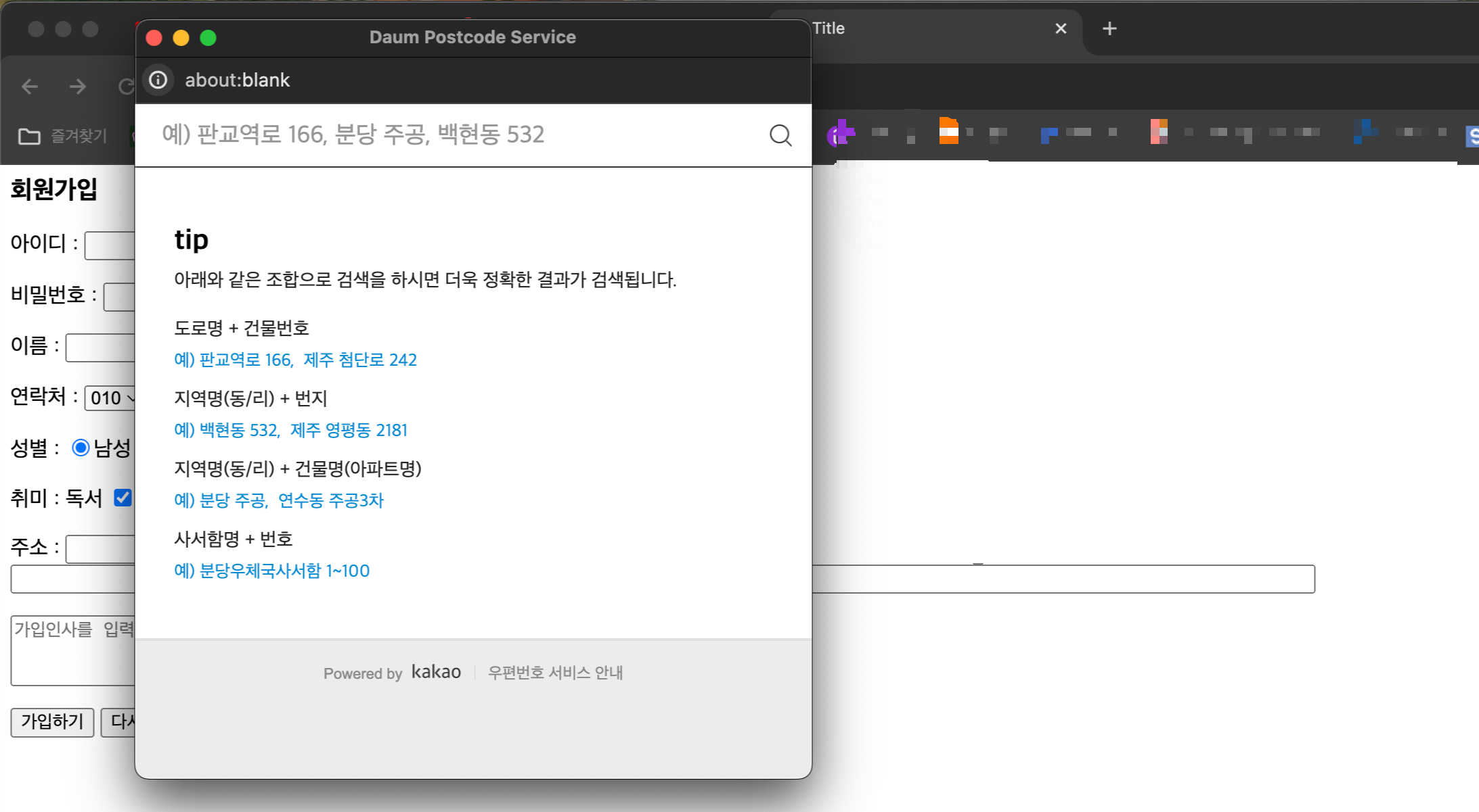 카카오 우편번호 검색 가이드 페이지 : https://postcode.map.daum.net/guide