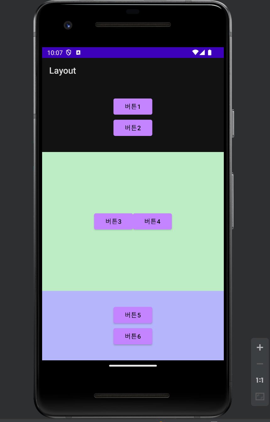 한 화면에 위젯을 수평과 수직으로 다양하게 배치해야 하는 경우, 리니어레이아웃 안에 리니어레이아웃을 생성하는 방식을 사용.