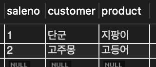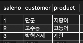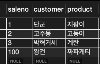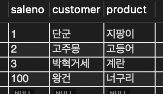 INSERT INTO tSale (saleno, customer, product) VALUES (2,'고주몽', '고등어');