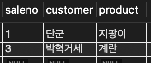 INSERT INTO tSale (customer, product) VALUES ('고주몽', '고등어');