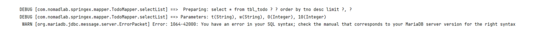✓ 't'와 'w'가 전달되었기 때문에 'from tbl_todo' 뒤에 두 개의 "?"가 생성된 것을 확인.