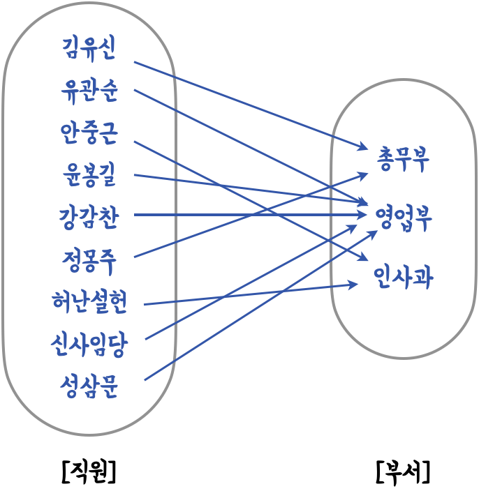 ➡️ 직원은 한 부서에 소속되며 한 부서에는 여러 명의 직원이 있음