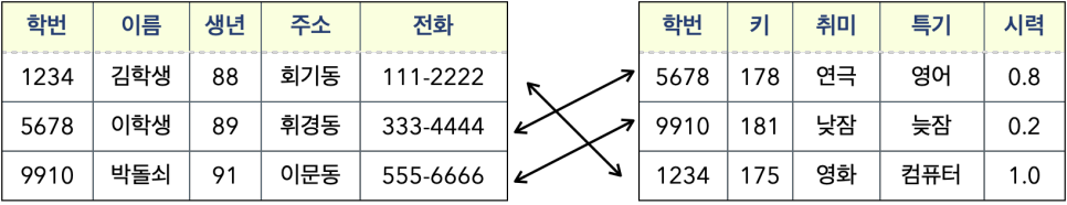 ➡️ 상세 정보를 알고 싶을 때 학생 테이블의 학번을 조사한 후 상세 테이블에서 학번이 같은 레코드를 참조