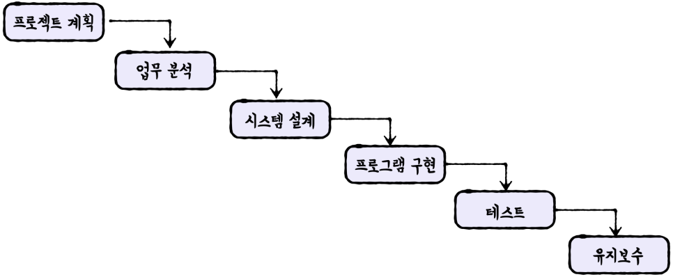 👩🏻🚀 소프트웨어 공학에서 제시하는 소프트웨어 개발 모델로 '폭포수 모델 Waterfall Model' 이 있다.