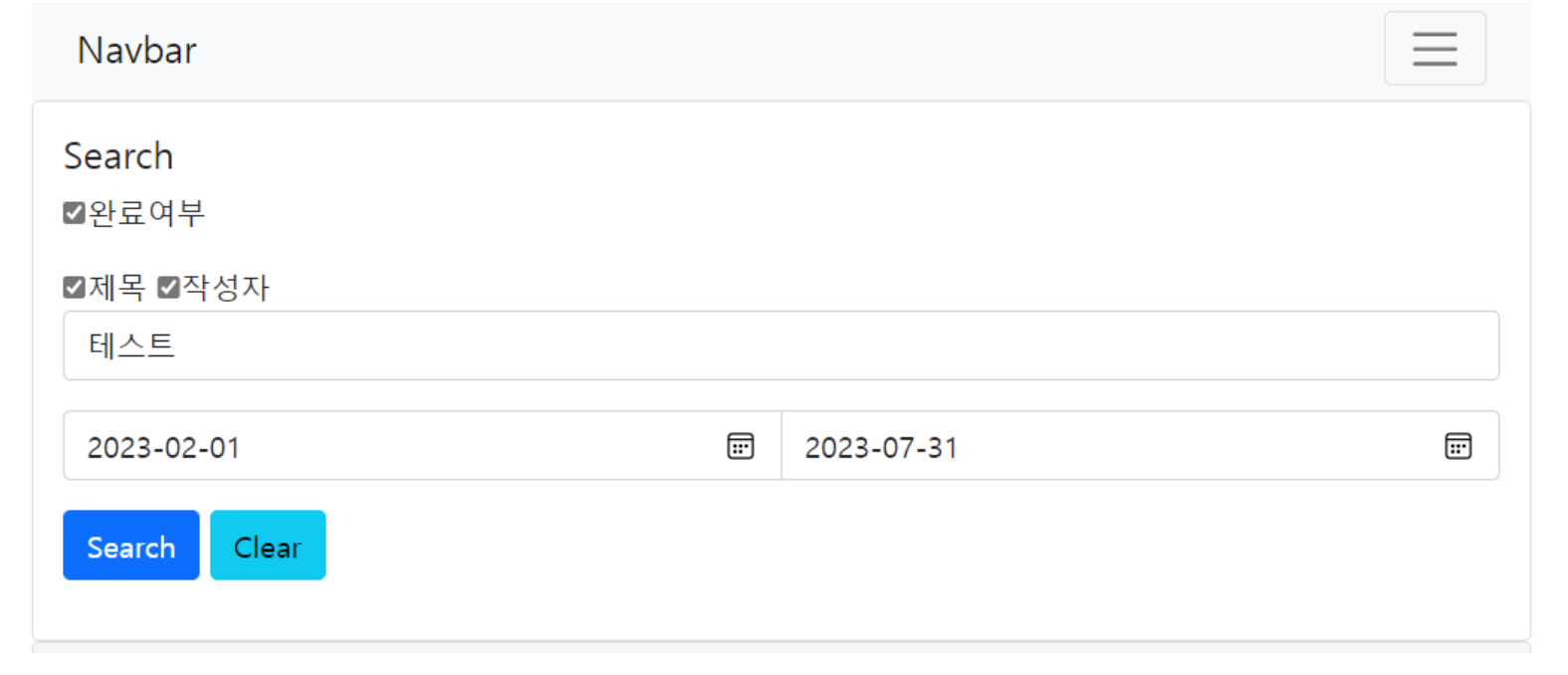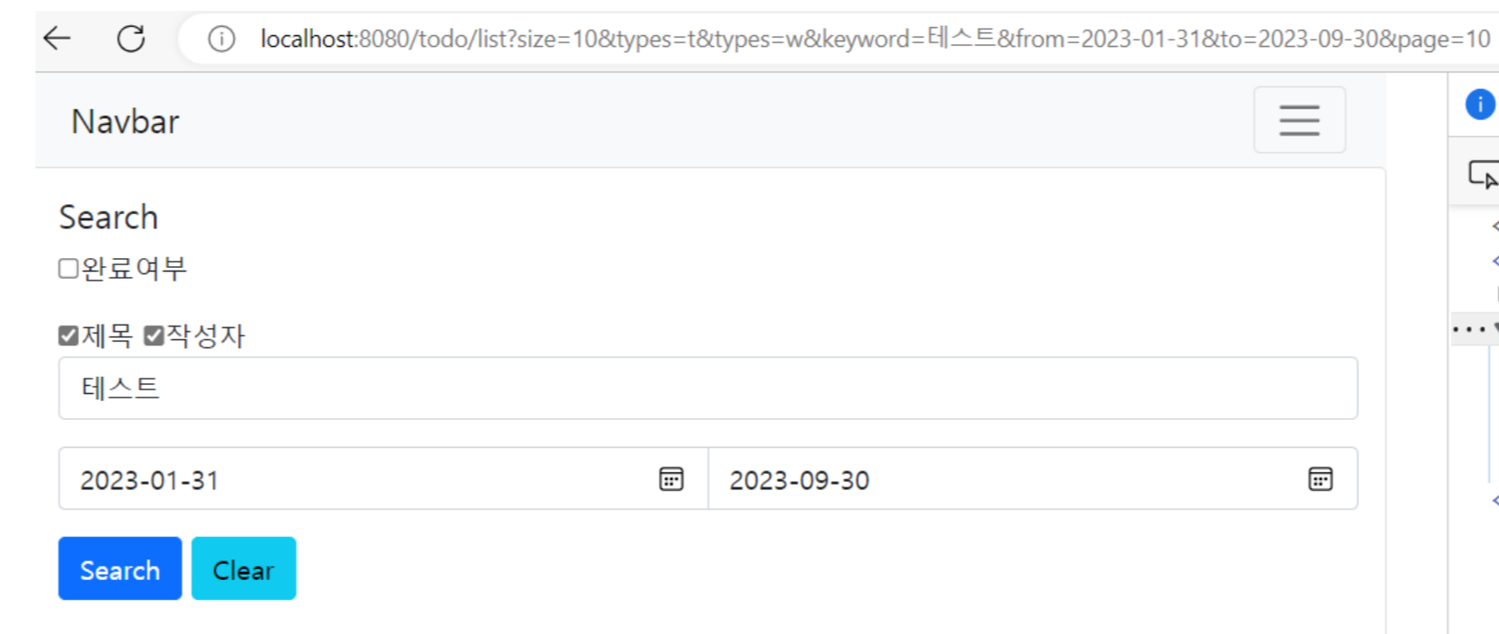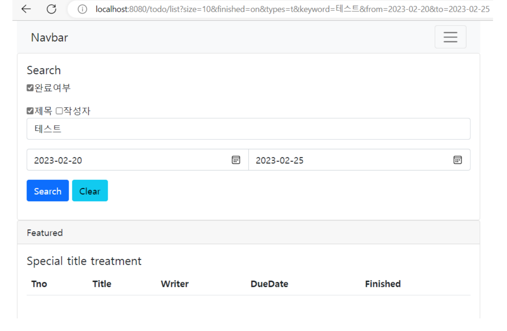 검색 영역에 Clear 버튼을 누르면 모든 검색 조건을 무효화 시키도록 '/todo/list'를 호출하도록 수정