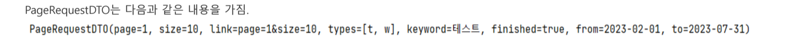 작성된 <div>에 EL을 적용할 때 가장 문제가 되는 부분은 제목 title, 작성자 writer를 배열로 처리하고 있으므로 화면에서 처리 할 때 좀 더 편하게 사용하기 위하여 PageRequestDTO에 별도의 메서드를 구성하도록 함