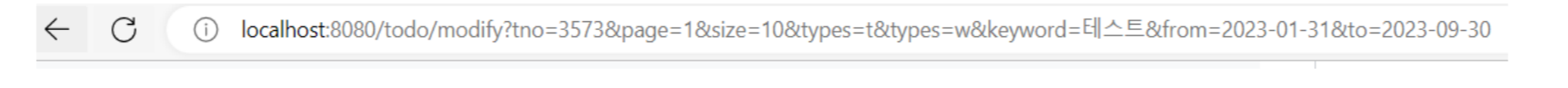 목록 -> 상세 -> 수정 페이지 이동시에 쿼리 스트링이 반영되는 것 확인