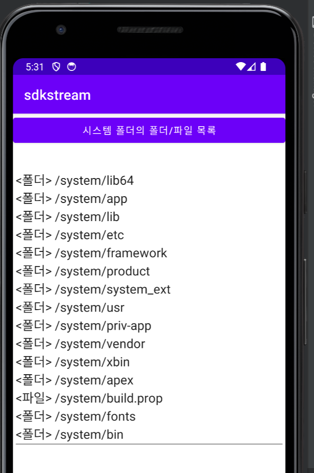android:text="시스템 폴더의 폴더/파일 목록" />