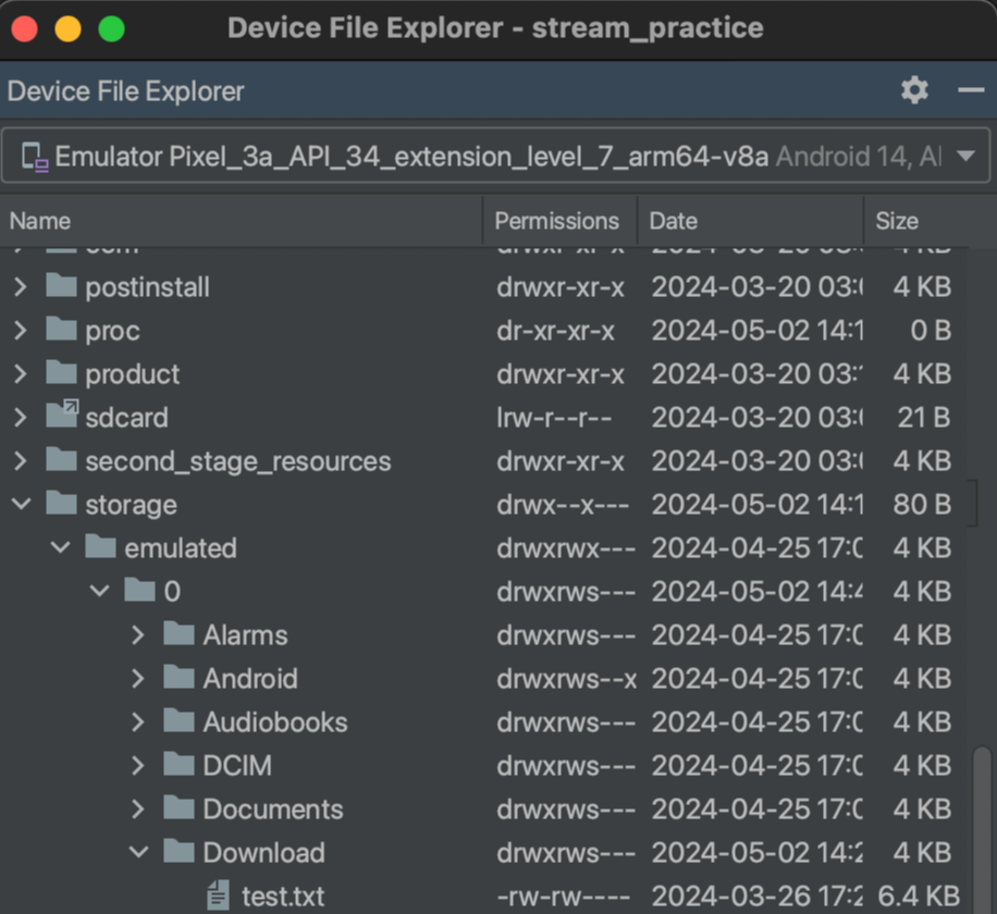 💫 먼저 Device File Explorer에서 /sdcard 폴더 또는 /storage/emulated/0 폴더에 적당한 텍스트 파일을 upload