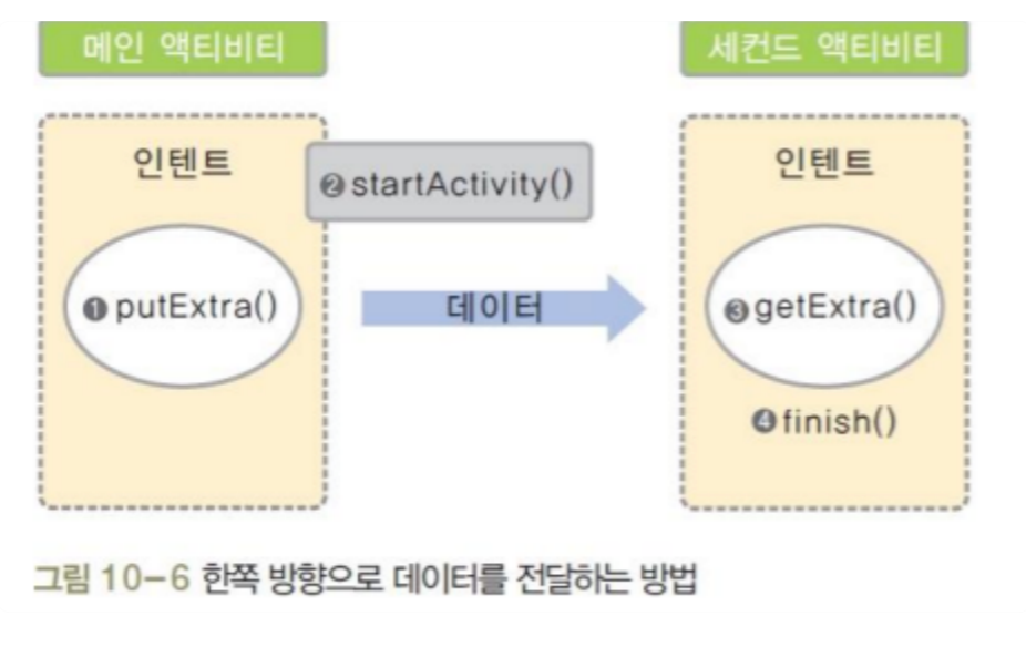 3) 인텐트를 받은 액티비티에서 getStringExtra(), getIntExtra(), getBooleanExtra() 등의 메서드로 넘어온 데이터에 접근