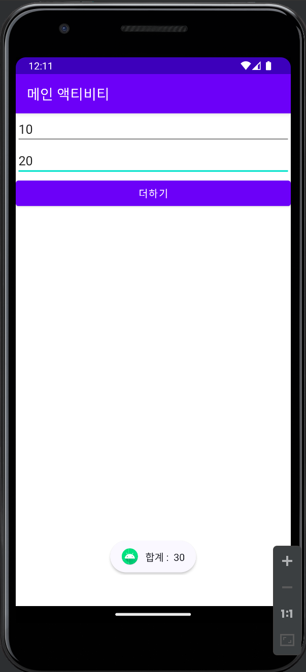 Toast.makeText(applicationContext, "합계 : ${sum}", Toast.LENGTH_SHORT).show()
