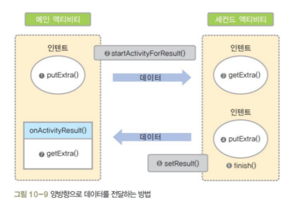 1) 메인 액티비티에서 putExtra()로 인텐트에 데이터를 넣는 것은 동일하지만, 세컨드 액티비티에서 데이터를 돌려 받으려면 액티비티를 호출할 때startActivityForResult() 메서드를 사용해야 함