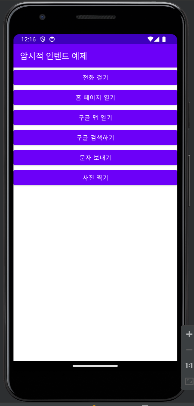 명시적 인텐트의 개념이 두 액티비티를 사용자가 직접 생성하고 코딩하는 것이라면, 암시적 인텐트 implicit intent는 약속된 액션을 지정하여 '안드로이드에서 제공하는 기존 응용 프로그램을 실행하는 것'