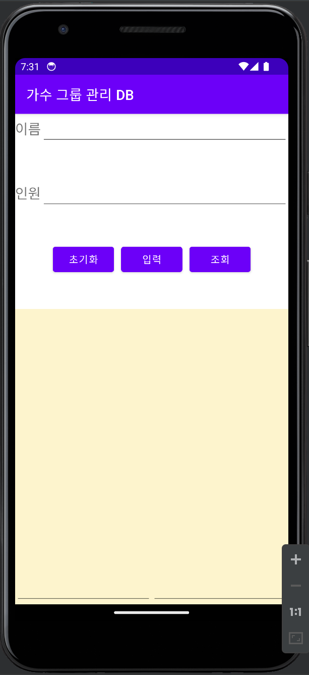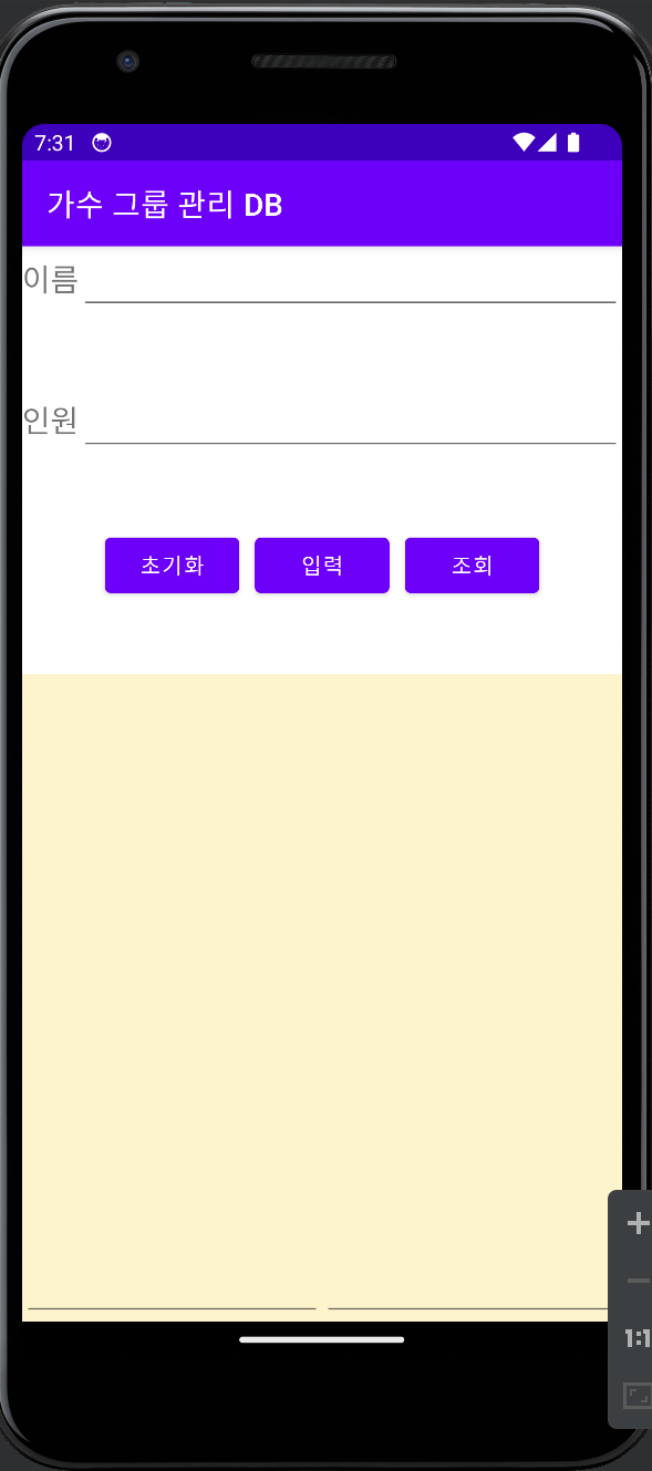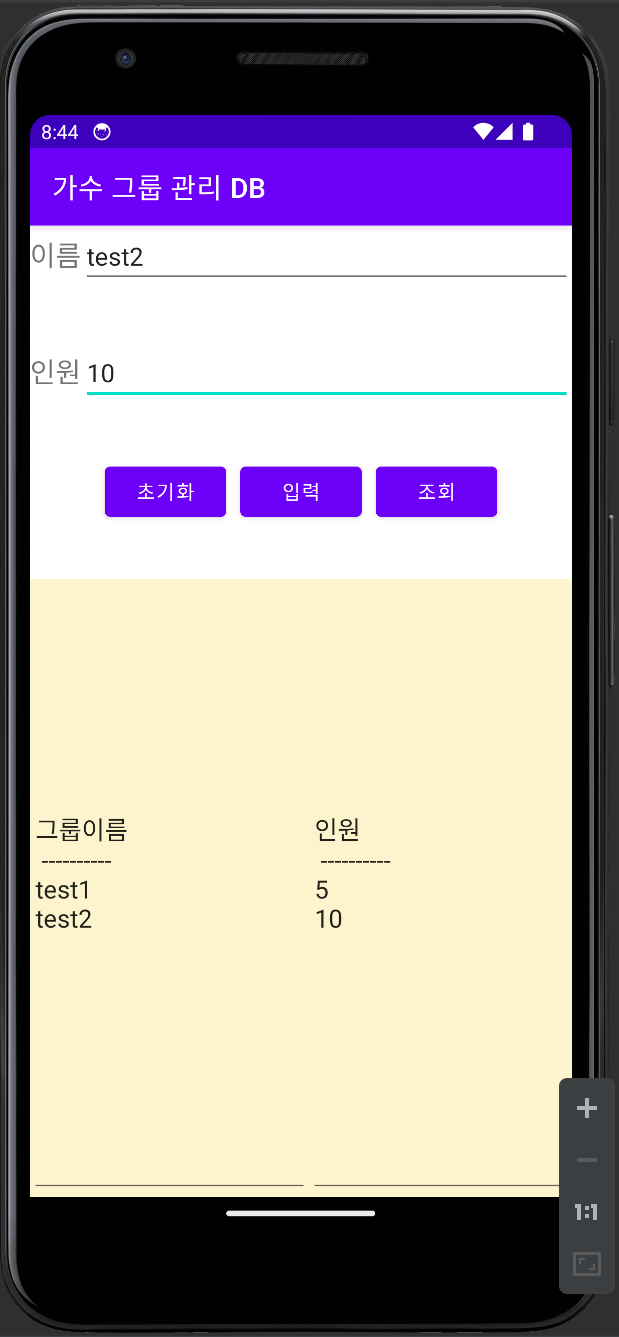 - 리니어 레이아웃 3 : 버튼 3개 (btnInit, btnInsert, btnSelect)