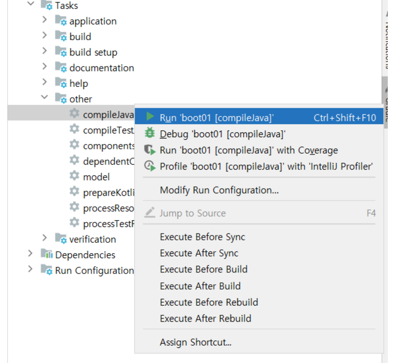 프로젝트 내에 Gradle 메뉴를 열어서 'other'부분을 살펴보면 compileJava task가 존재하는데 이를 실행.