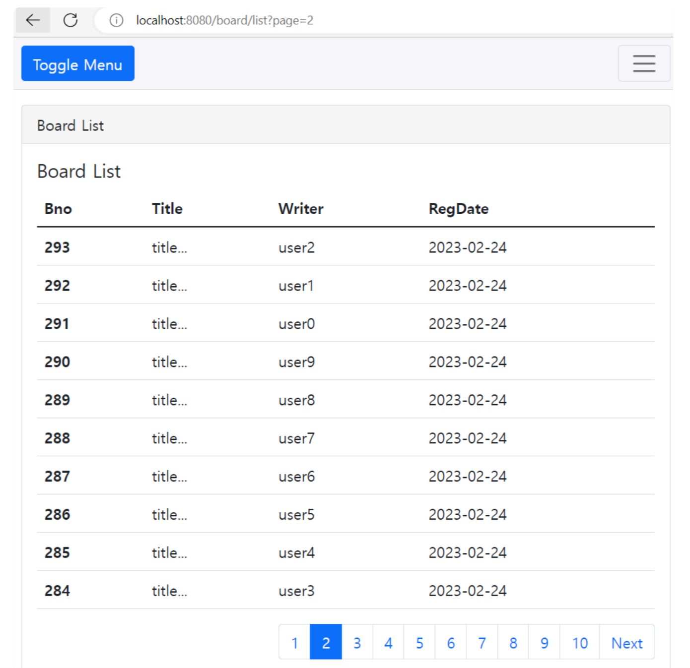 📍 브라우저에서 직접 URL을 변경하는 방법으로 '/board/list?page=2'와 같이 페이지 번호를 쿼리 스트링으로 추가해서 페이지 변경되는 것을 확인