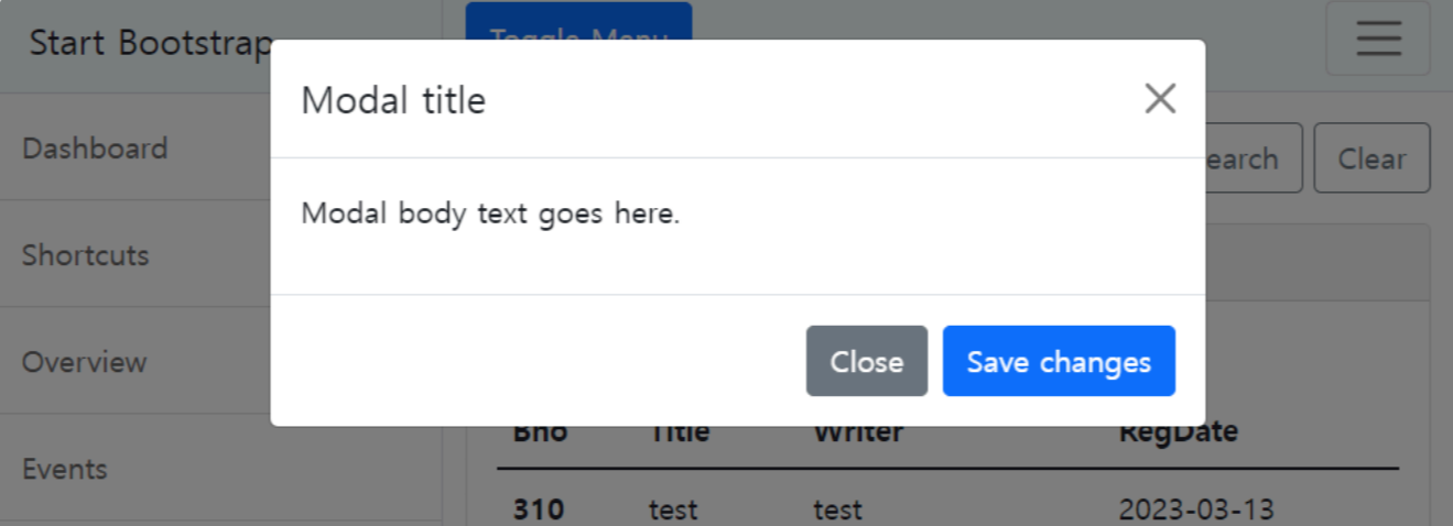 ✓ 자바스크립트에서는 부트스트랩의 함수를 이용해서 모달창이 보이도록 처리