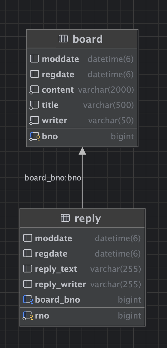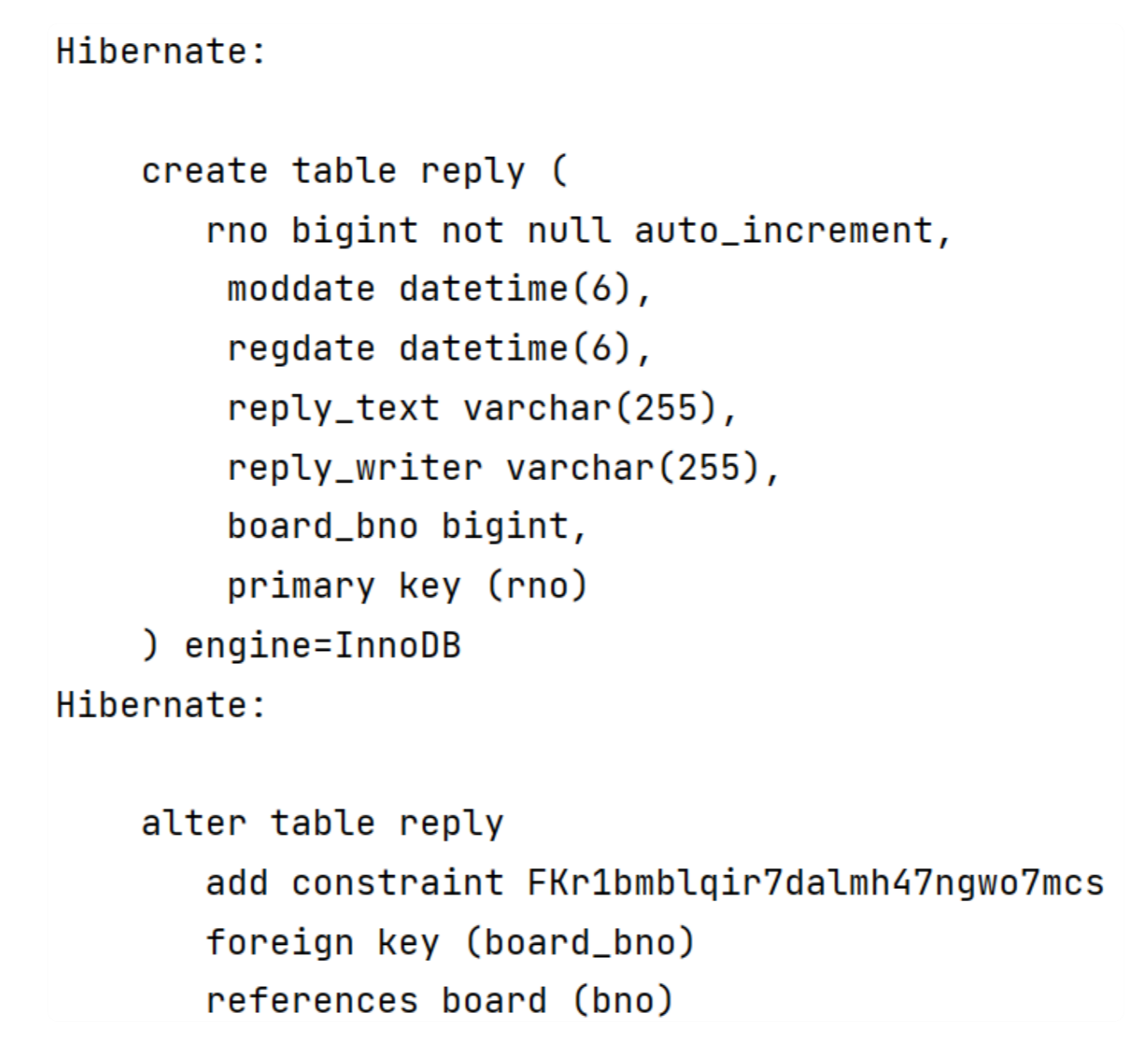 ✓ 생성된 테이블에서는 게시물 Board과 관련된 속성으로 'board_bno'라는 컬럼이 생성되고, 자동으로 FK가 생성
