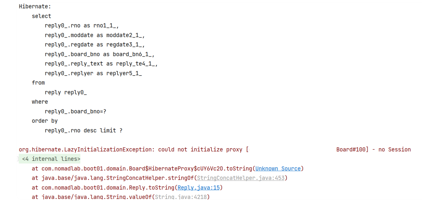 👾 Reply 클래스의 @ToString()에서 exclude를 제거해 보면 이런 동작을 확인할 수 있음