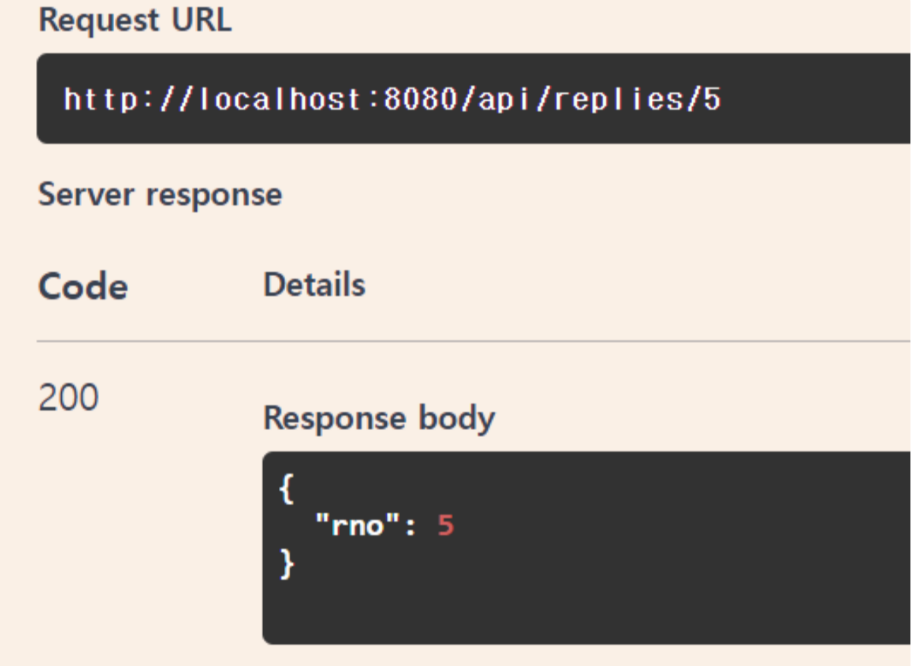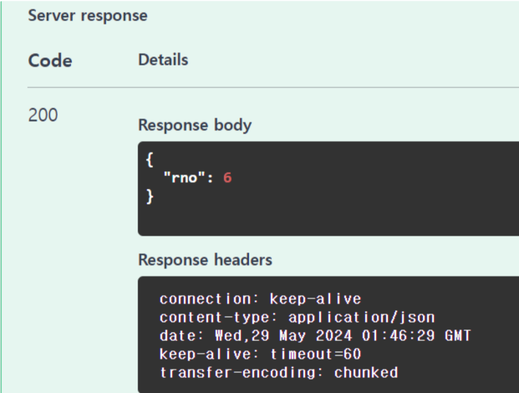 ✓ 정상적으로 동작하면 {"rno": 6}과 같은 결과가 전송되는 것을 확인