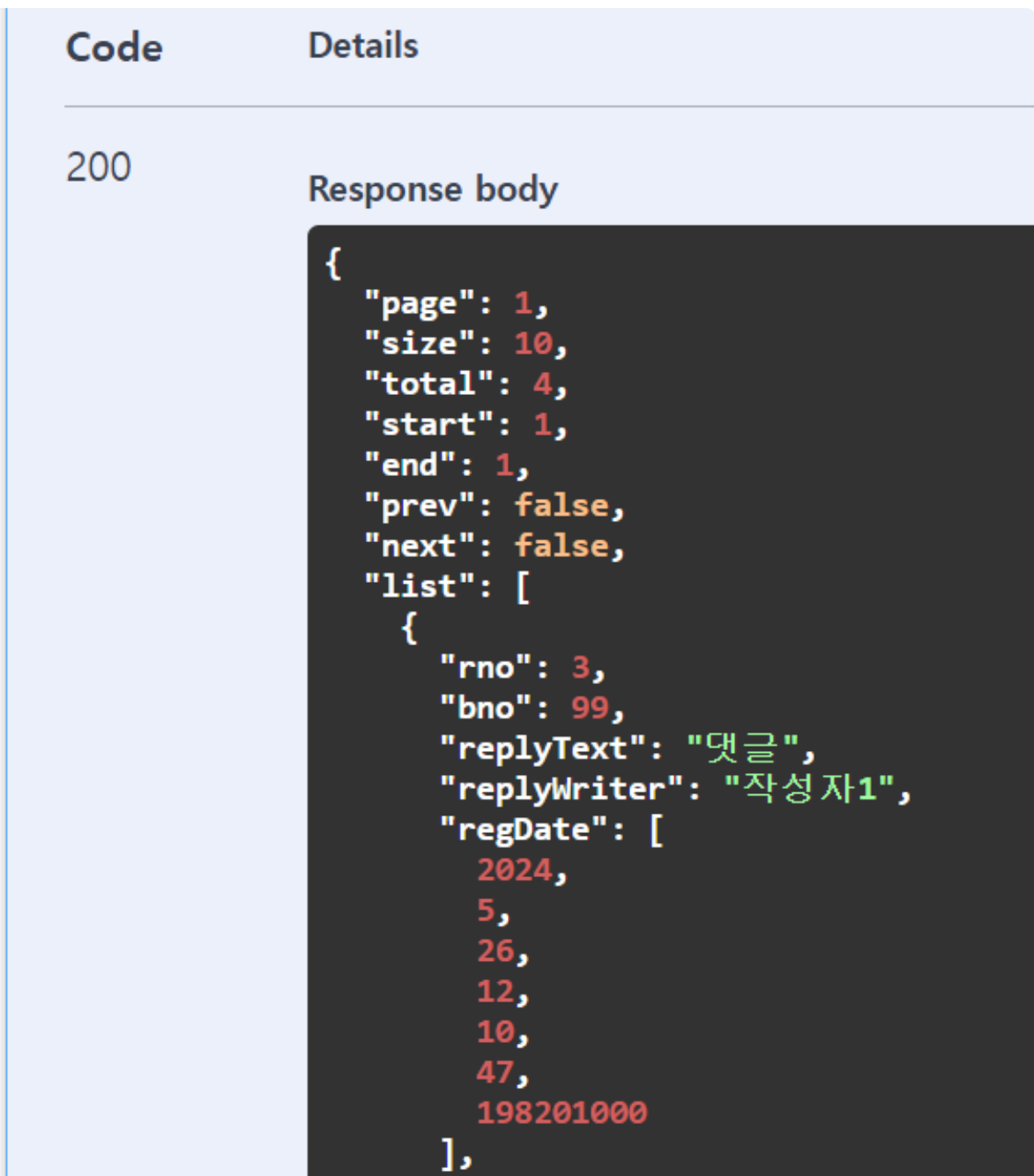 ✓ Swagger UI로 ReplyController를 호출해 보면 PageResponseDTO가 JSON으로 처리된 결과를 볼 수 있음