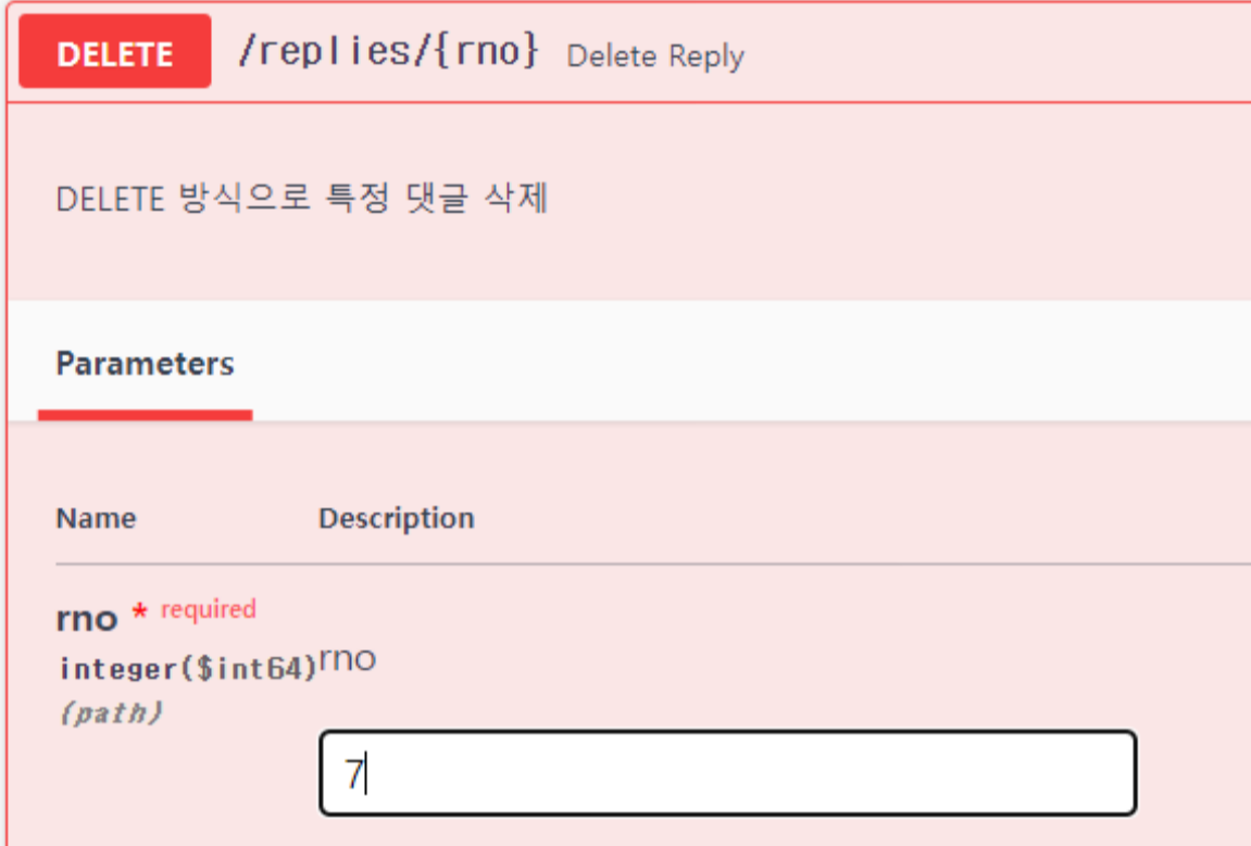 ✓ 프로젝트를 실행하고 Swagger UI를 통해서 테스트를 진행. 등록 작업에서 주의할 점은 bno가 존재하는 게시물 번호여야 함