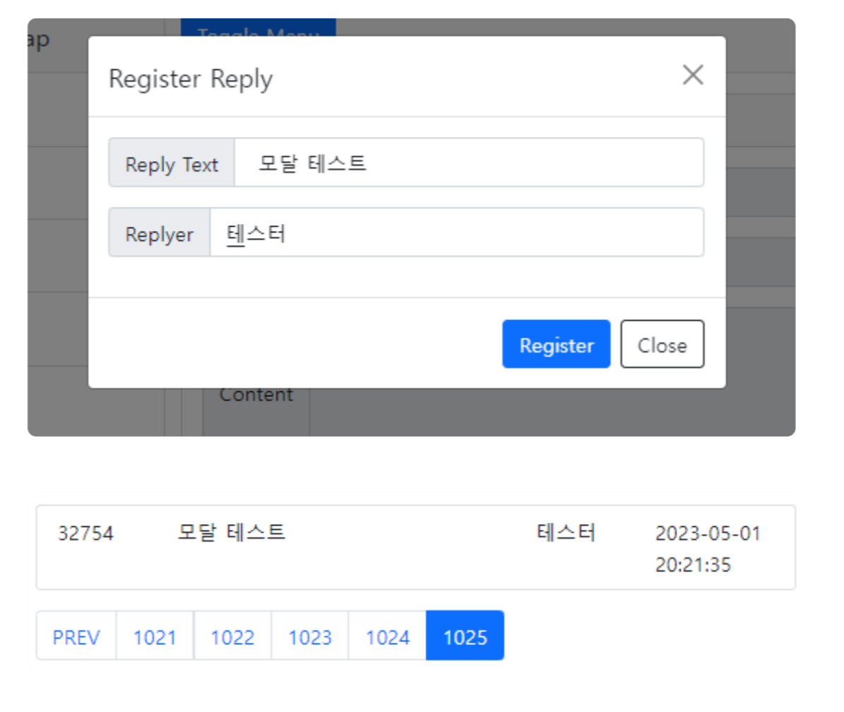 ⚡️ 모달창을 이용해서 새로운 댓글이 필요한 replyText나 replyWriter를 입력하도록 구성하고, 자바스크립트의 객체로 POST 호출하도록 구성
