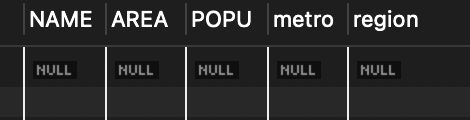 📌 인구와 면적이 NULL 가능하다고 되어 있음. 정보가 아직 조사되지 않았거나 모르는 상태일 때 이 필드를 NULL로 남겨 둠.