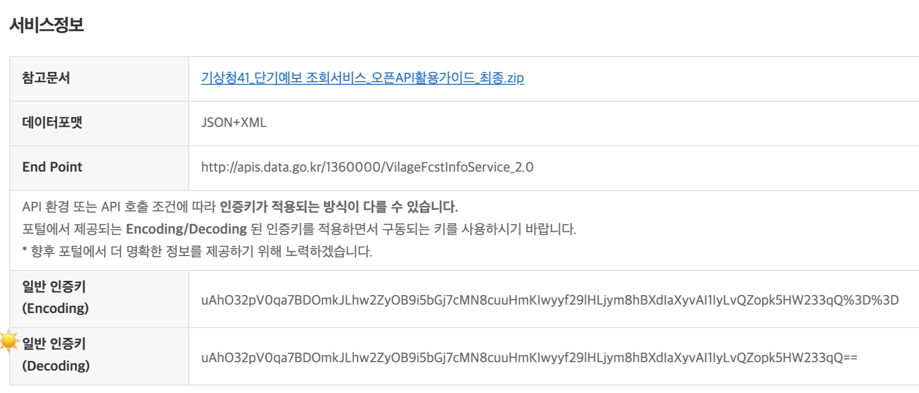 # 1) 서비스 키: requests 사용시 자동으로 인코딩되어 decoding된 키를 사용