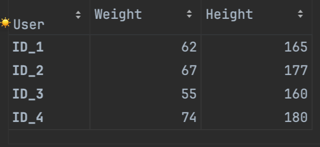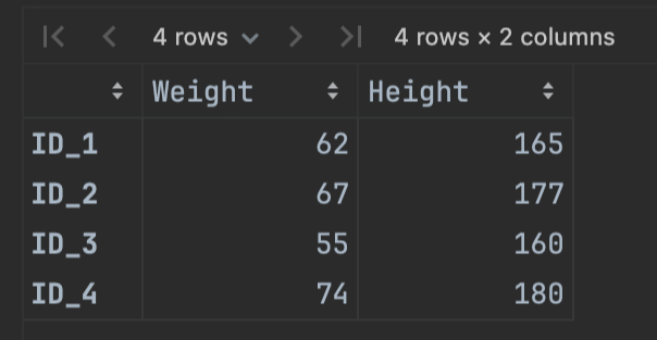 df_WH = pd.DataFrame({'Weight': [62, 67, 55, 74],