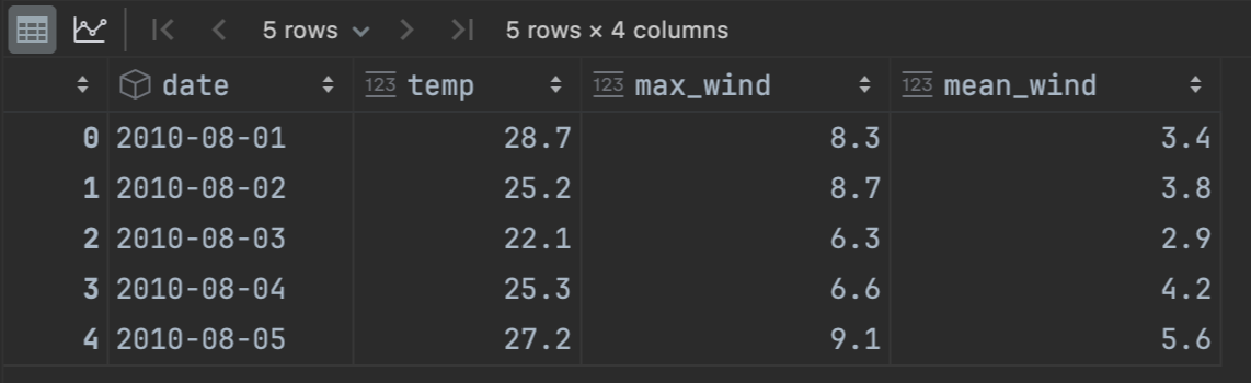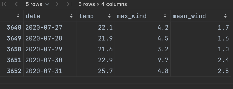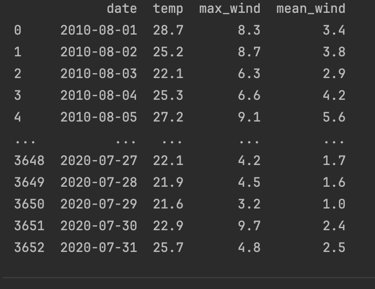 # 출력 결과: Index(['date', 'temp', 'max_wind', 'mean_wind'], dtype='object')