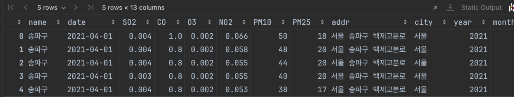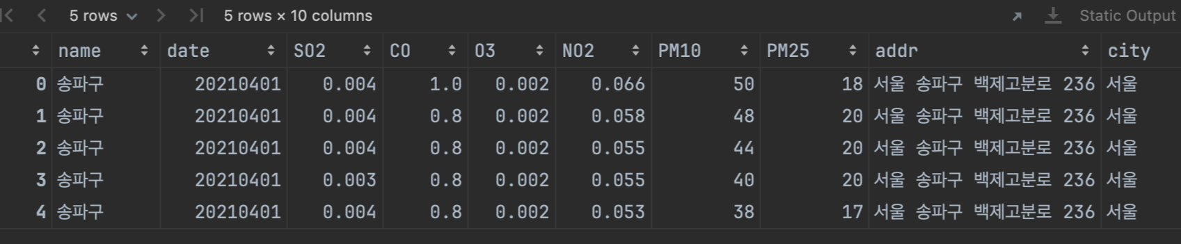 Index(['name', 'date', 'SO2', 'CO', 'O3', 'NO2', 'PM10', 'PM25', 'addr',