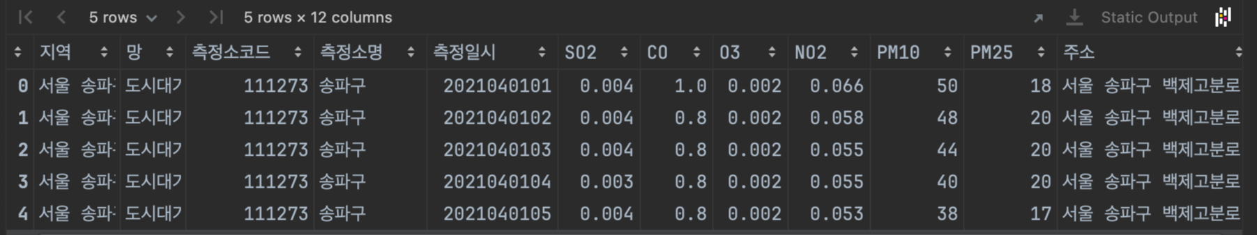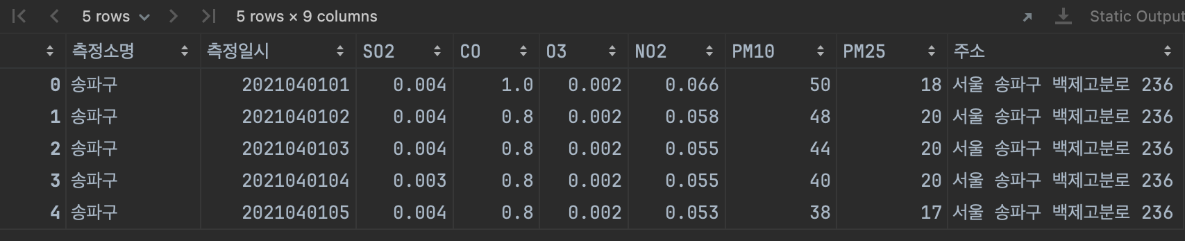 dust.rename(columns={'측정소명': 'name', '측정일시': 'date', '주소': 'addr'}, inplace=True)