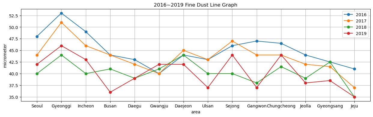 # 3) 2016 ~ 2019년 미세먼지 선 그래프