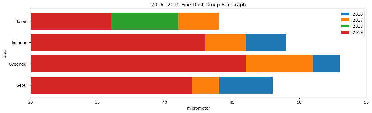 # 2016 ~ 2019 지역별 미세먼지 그룹 누적 가로 막대 그래프