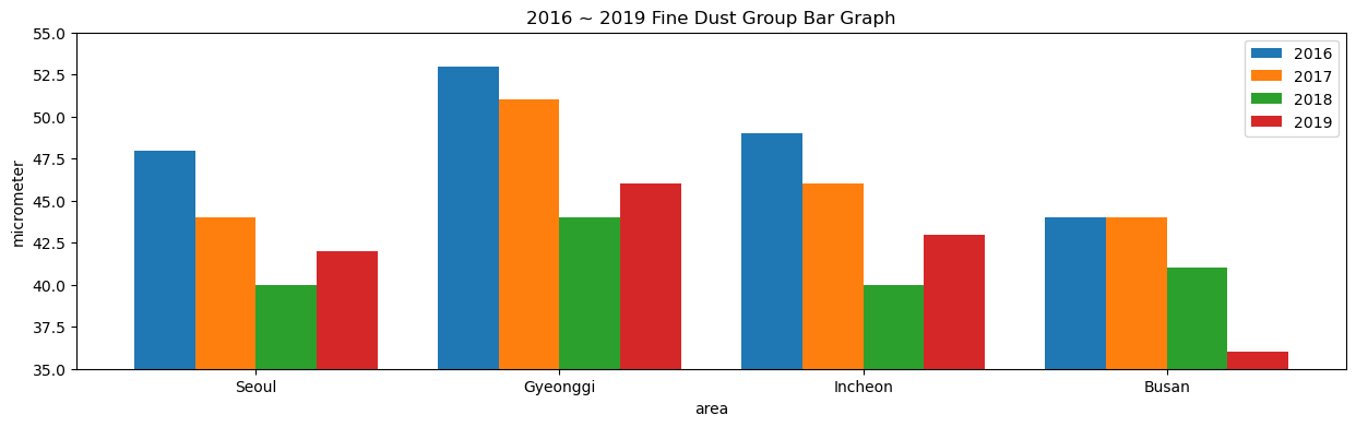 plt.title('2016 ~ 2019 Fine Dust Group Bar Graph')