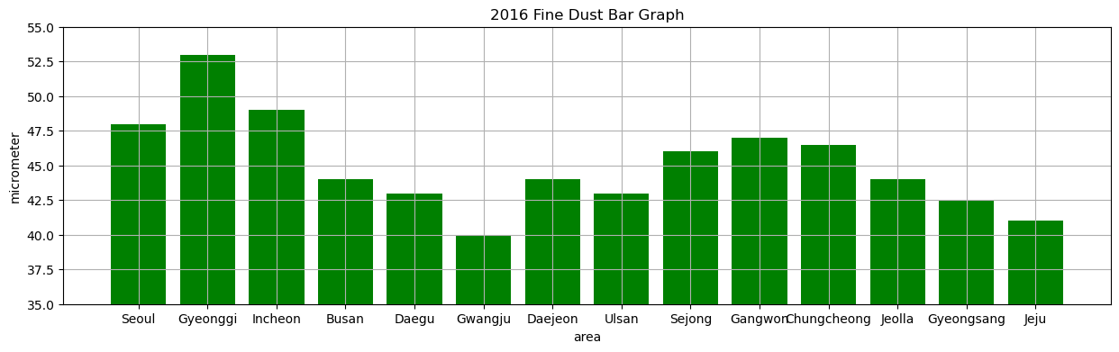 # 2016년 지역별 미세먼지 세로 막대 그래프