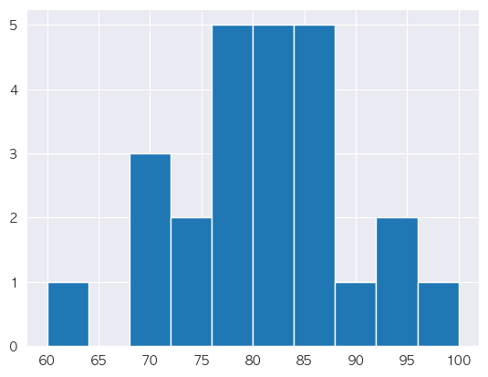 2. 계급 간격 설정 및 계급 생성 : 변량 중 가장 작은 숫자가 60이고 가장 큰 숫자가 100이므로 60에서 일정한 간격
