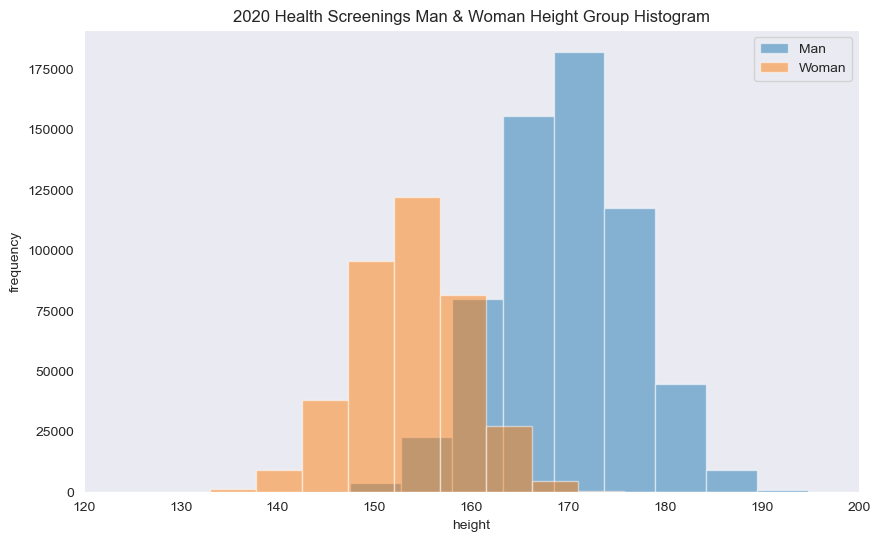 plt.title('2020 Health Screenings Man & Woman Height Group Histogram')
