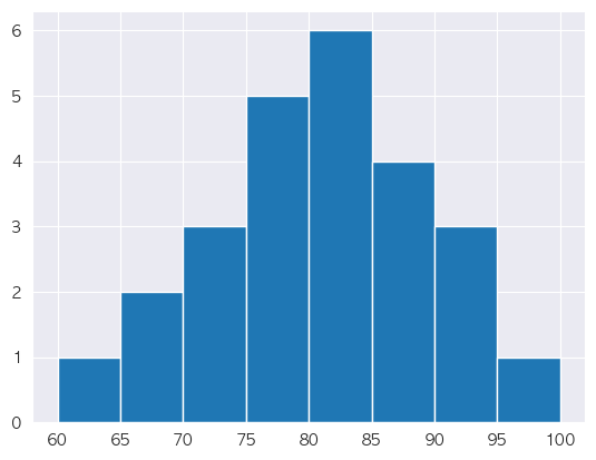 📌 hist() 함수의 bins 파라미터는 히스토그램의 가로축 구간의 개수를 지정