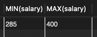 SELECT MIN(salary), MAX(salary) FROM tStaff WHERE depart = '영업부'; // 영업부에서 가장 낮는 월급과 가장 높은 월급