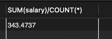 SELECT SUM(salary)/COUNT(*) FROM tStaff; // 평균은 총합을 개수로 나누어서 구함 위의 문장과 동일