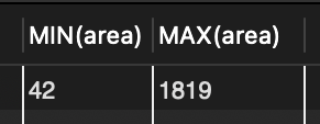 SELECT MIN(area), MAX(area) FROM tCity; // 모든 도시의 area 필드를 조사하여 가장 작은 값과 가장 큰 값을 찾음.