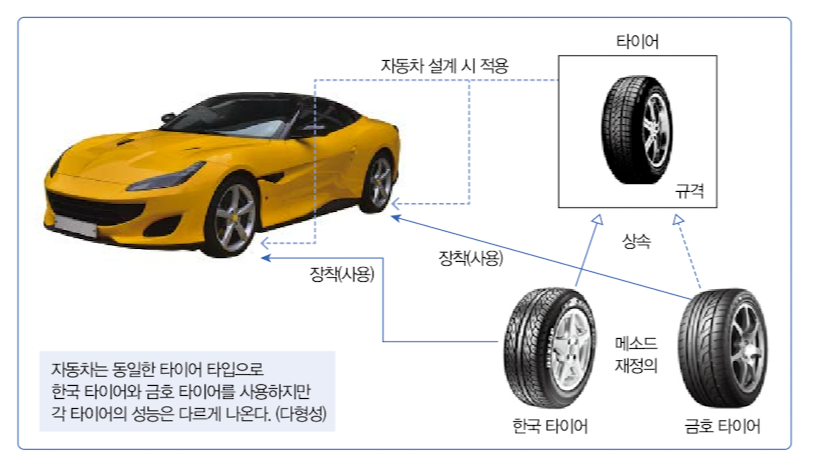 한국 타이어와 금호 타이어는 모두 타이어를 상속하고 있으므로 부모의 메소드를 동일하게 가지고 있다고 말할 수 있다.