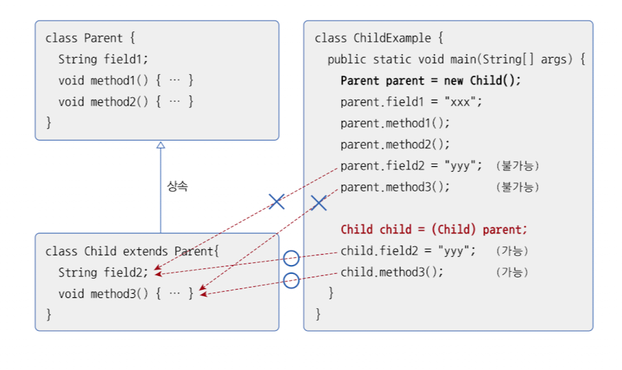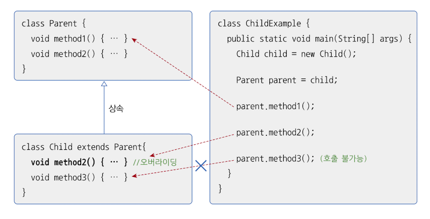이것을 '다형성' 이라고 하는데 다형성을 구현하기 위해서는 자동 타입 변환과 메소드 재정의가 필요하다.